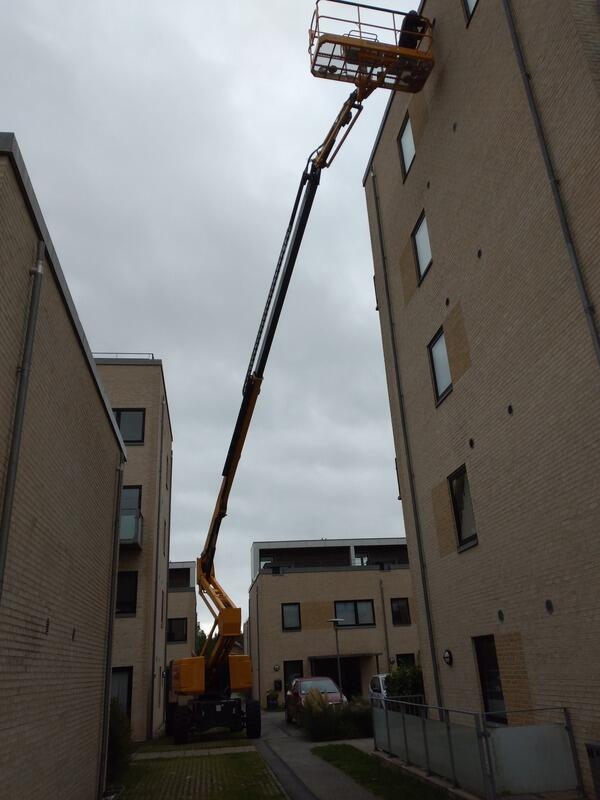 En tur højt op i luften i Svendborg. Riste skal renses, så der kan komme luft igennem. Skidt kan desværre sætte sig i de fleste ting, og det giver nu bare bedre indeklima når risten er ren og luften kan passere. Kanalerne er allerede renset, så nu skulle beboerne i disse blokke hos #FAB gerne kunne mærke en forskel.